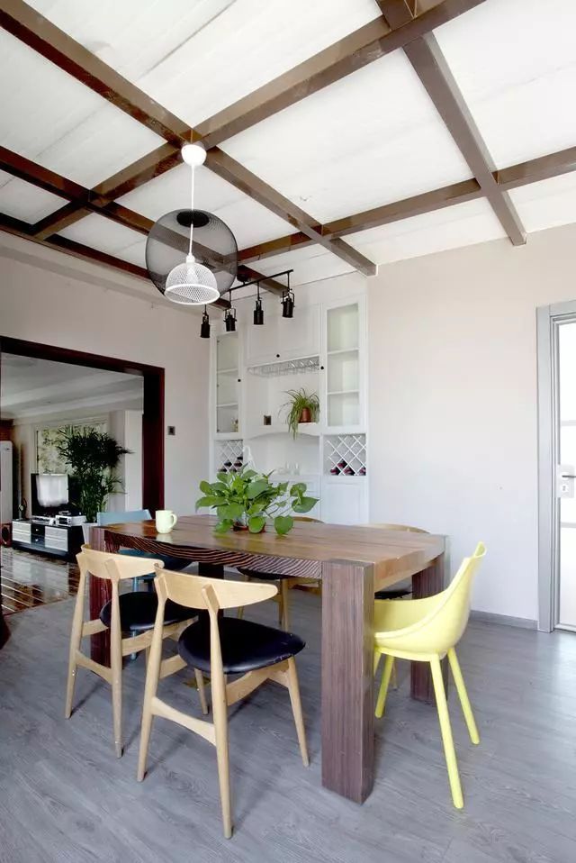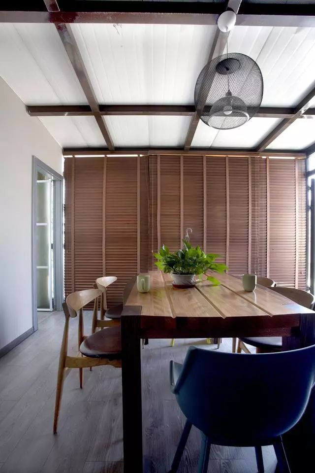 餐厅选择了长条形餐桌,餐厅阳台的木质百叶帘很有韵味,遮光性与装饰性兼得。