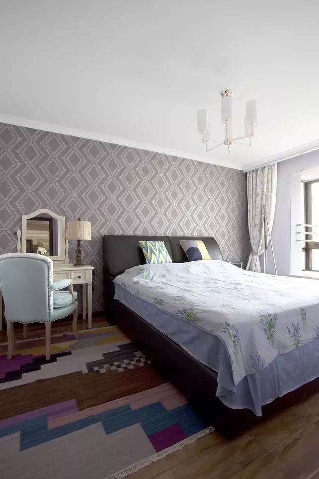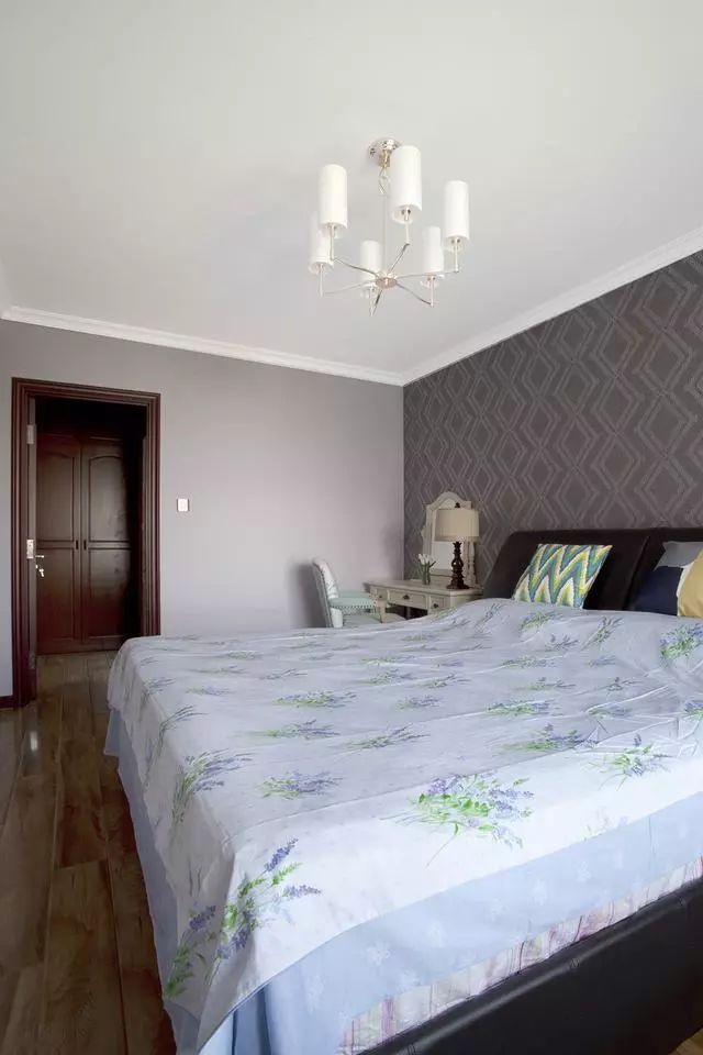 主卧床头的暗纹壁纸体现大气简约的效果,让人能感受到一种华贵的气息。