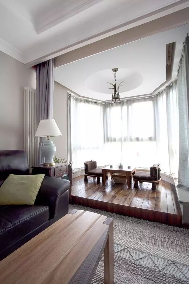 客厅阳台,八角落地窗是户型的优势,配合圆形吊顶和地台的设计,放置茶桌就是闲静的一角,考虑到采光问题,选择了中性的卡其色,在视觉上也放大了空间。