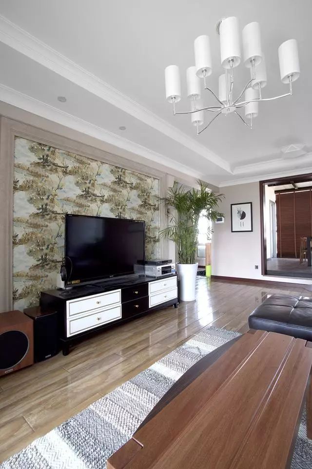 客厅天然纹路的电视墙壁纸大气沉稳。